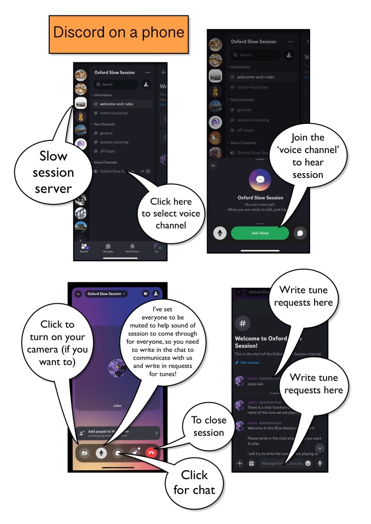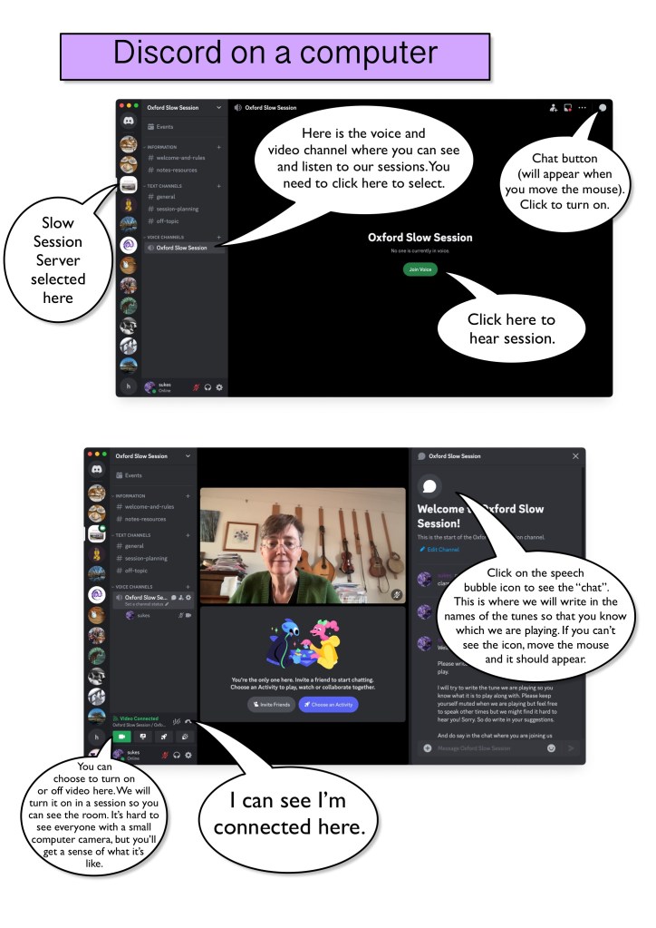 You can choose whether to download it to your machine or stay on it via a browser. And your username can be whatever you like (I think). Ideally, if possible, it is a good idea to have two gadgets for the session: one to listen to the session (using Discord), and another to have access to the Slow Session website for the music (if you want to read music). Alternatively you can use the link to print out all the music, although I think turning pages is slower than clicking tabs. However, you will be muted (ie you will hear the session, but we won’t hear you, so you can happily play along however you like!