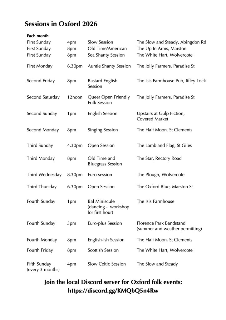 Louis recently posted a useful summary list of local Oxford sessions, but it is also useful to check on Folk in Oxford, particularly their calendar which often includes gigs as well as sessions. If you know a session that I’ve haven’t listed, please do let me know by emailing oxfordslowsession2014@gmail.com