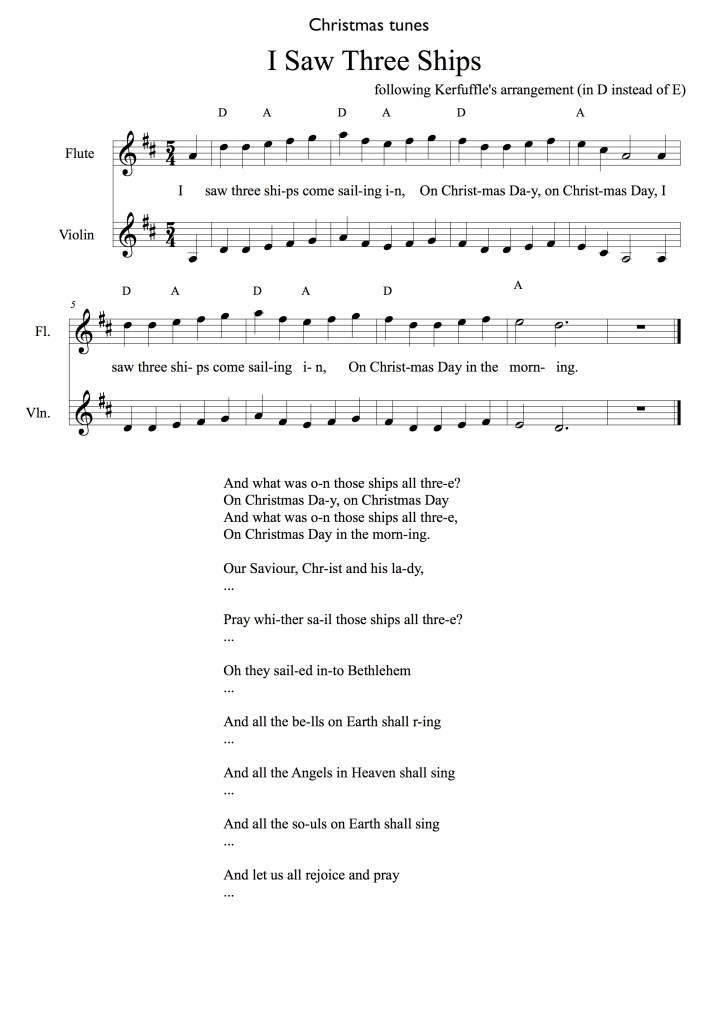 Homage to Kerfuffle continues with their arrangement of I Saw Three Ships (and many thanks to Jane for transcribing, especially with the riff). I think this would be a fun project for us before Christmas and trying to play in 5/4 will definitely give us a new challenge.