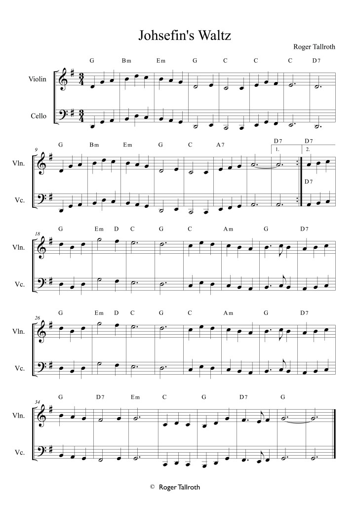 I’ve been listening to Johsefin’s Waltz for a long time, mostly played by Alasdair Fraser and Natalie Haas, but this year, at their summer camp in Skye, we played it many times at the slow session there and it occurred to me that it would make a good addition to our collection. Written by Roger Tallroth of the Swedish band, Väsen, you can hear them playing it here, and also playing it with Chris Thile too (the legendary mandolin player).