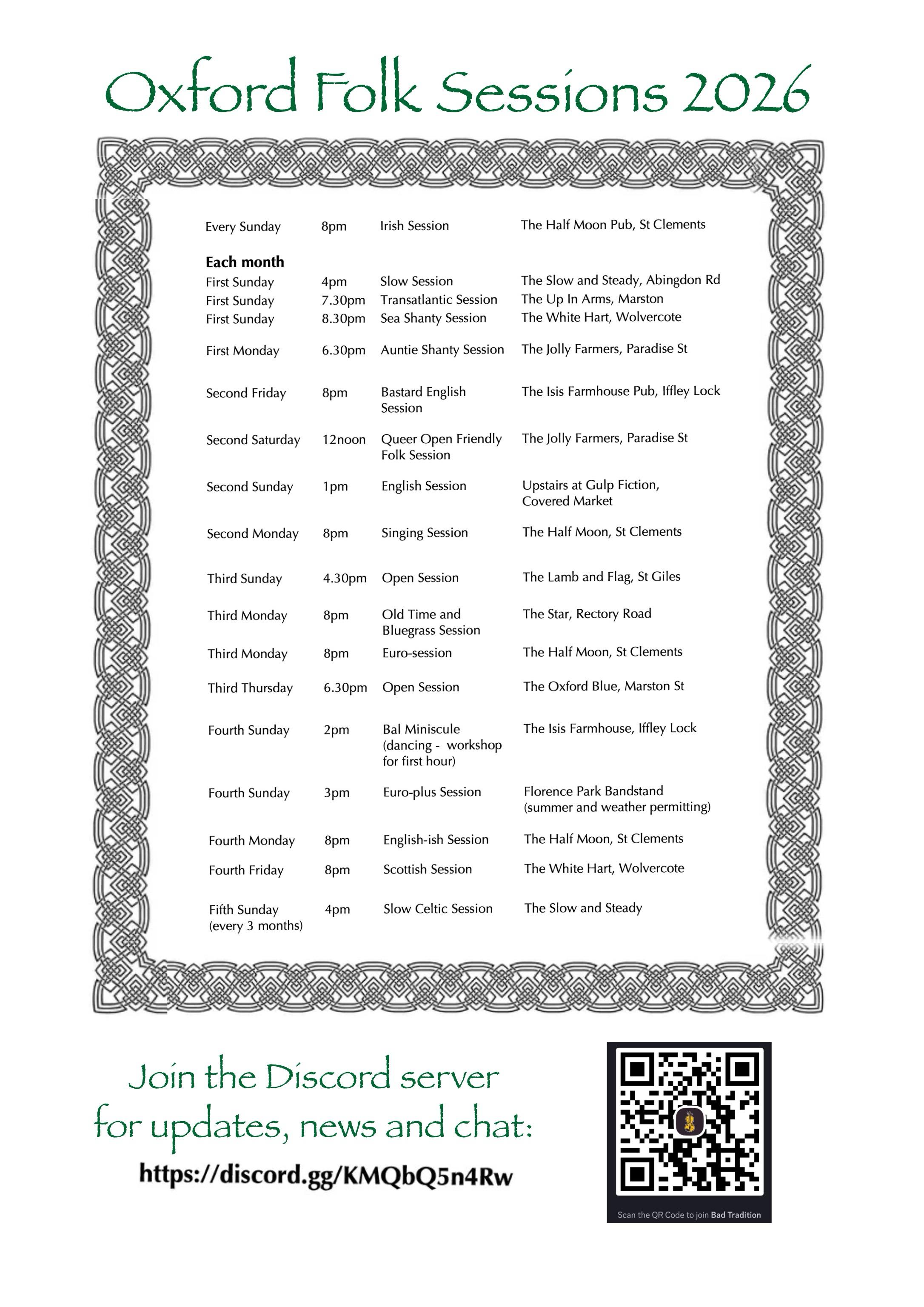 We will also have a Slow Session on 12th April 2026, 4pm as part of the Oxford Folk Festival (which does mean three sessions on three Sundays in a row!)